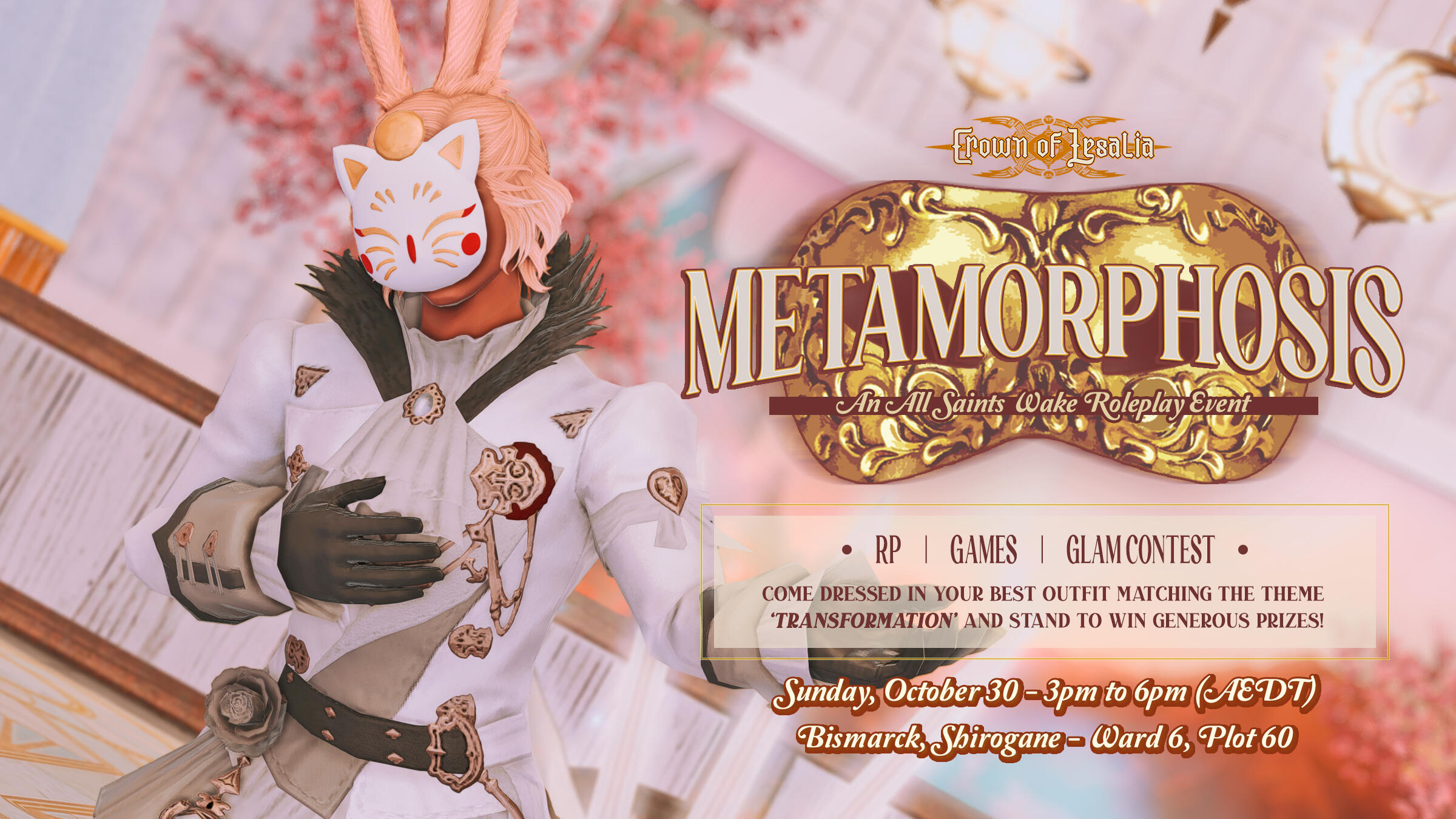 Take part in our Glam Contest! Come dressed in an outfit that you think best showcases the theme 'Transformation', and stand a chance to win some fabulous prizes, such as Fae Crown Weapons, Barding, or One Million gil!The Glam contest will begin at 4:30PM (AEDT). Participants will be called to the side of the stage and given the chance to strut their stuff and give a quick description of their costume.The judges will be scoring based on the following criteria: Creativity, Uniqueness, Adherence to Theme, and a little bonus for their presentation.